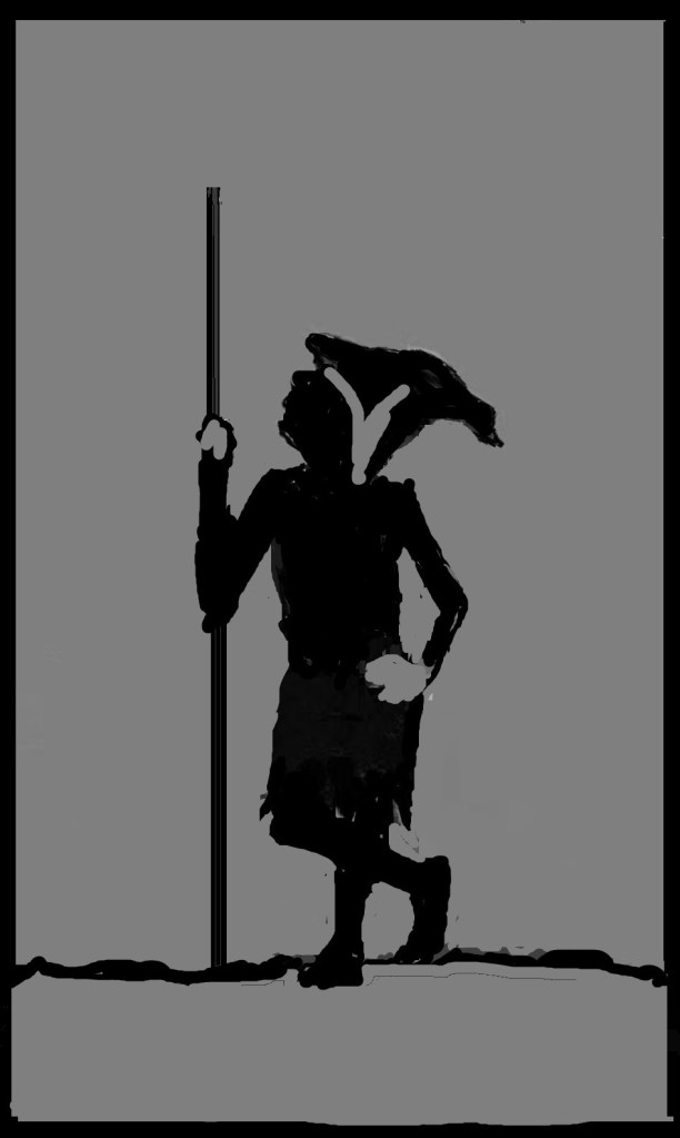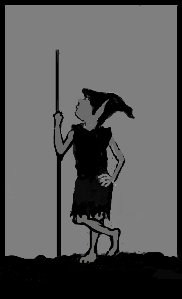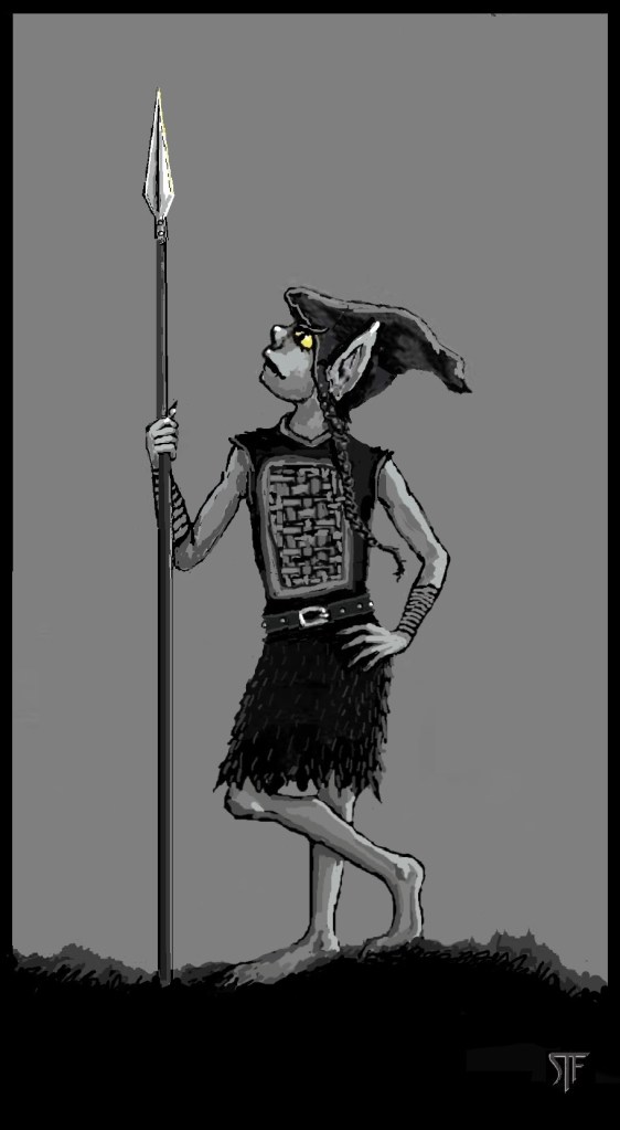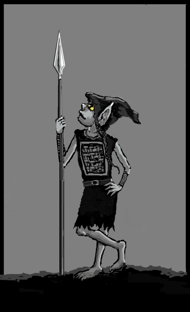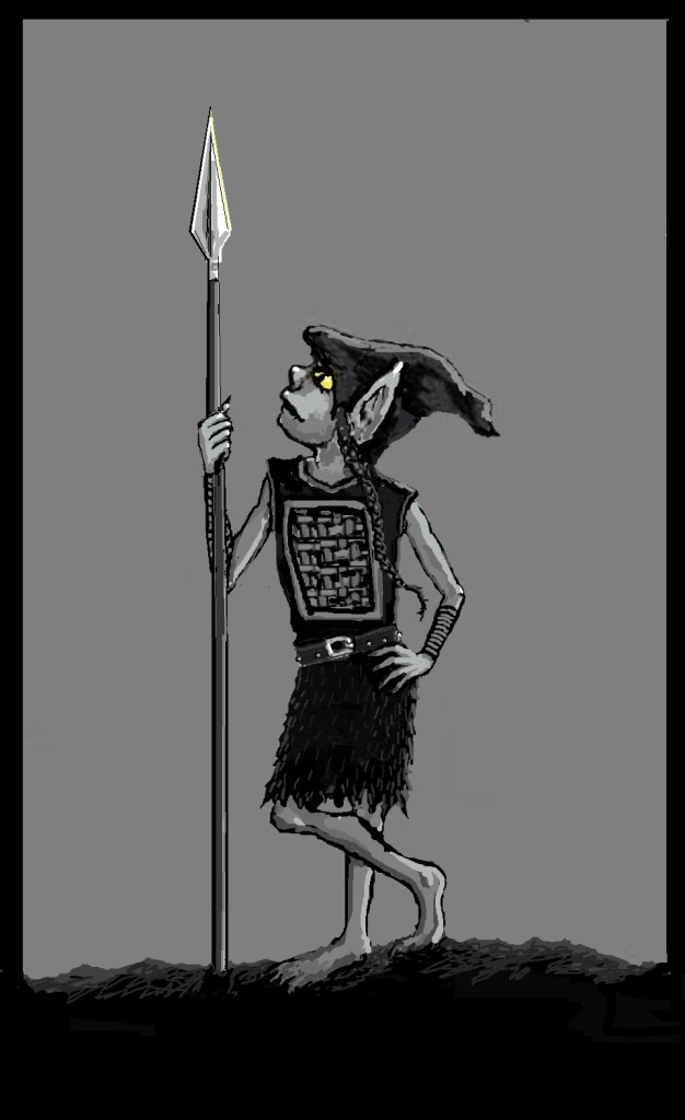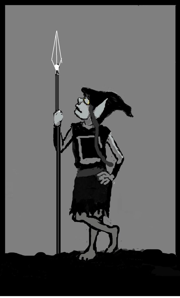 I’m creating an illustration of Rhoona, a female trog (troglodyte) who is a fun character and very good with a spear. (If you want to learn more about TROGS, check out BOOK 1: ALONG THE JAGGED EDGE).